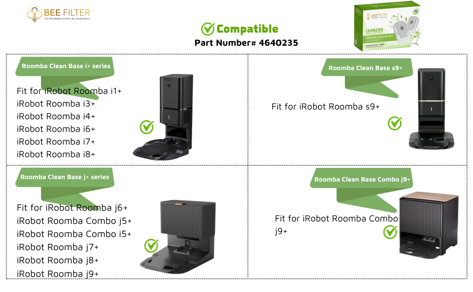- For those who rely on the impeccable suction and cleaning capabilities of the iRobot Vacuum Bags i7+, i1+, i3+, i4+, i6+, i8+, Combo j5+, Roomba j7+, j8+, j9+, Combo i5+, Combo j7+, Combo j9+, maintaining the vacuum’s efficiency is crucial. That’s where our iRobot Roombag Bags replacement comes into play. Bee Filter Premium ensures your iRobot Roomba vacuum retains its peak performance.