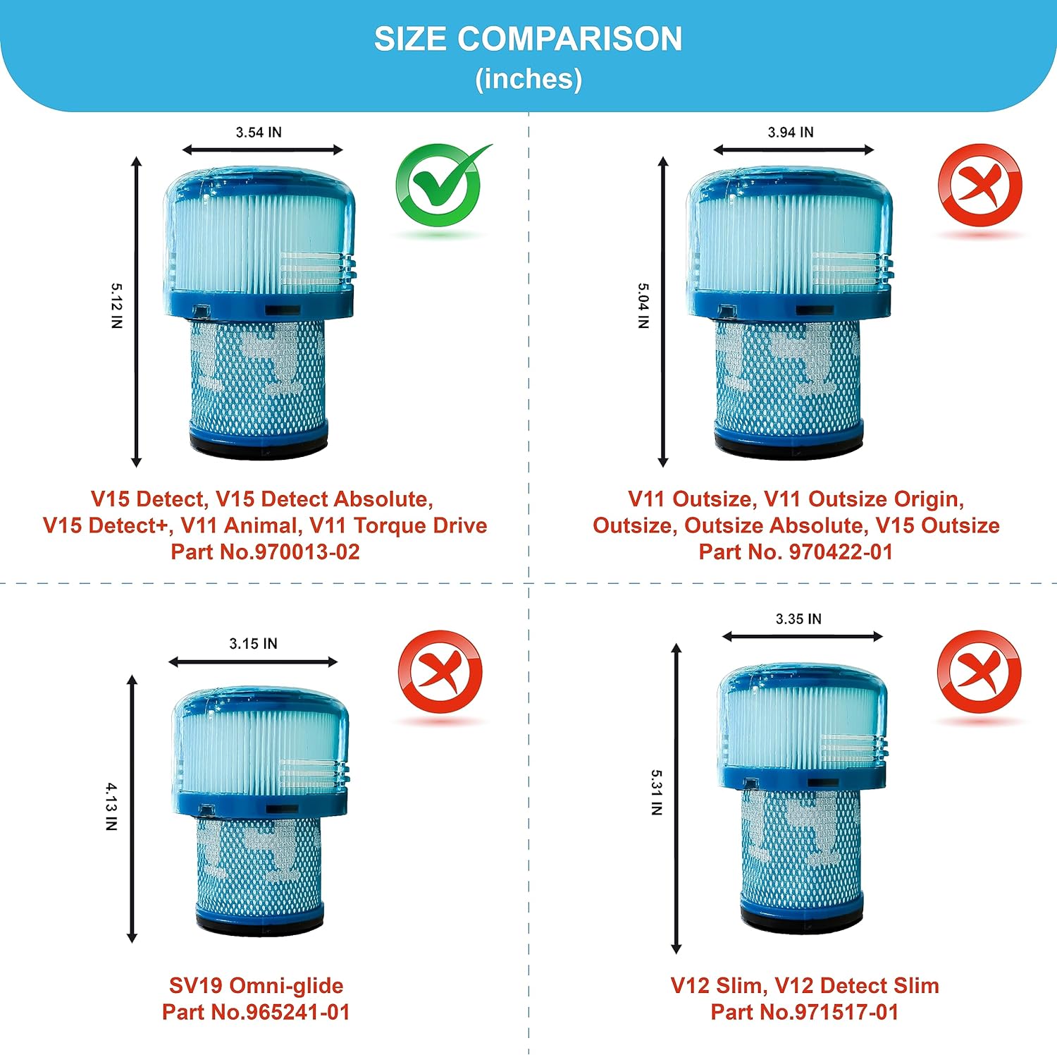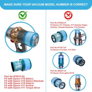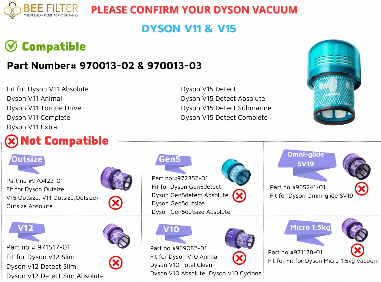 Notice: BEE FILTER Premium Vacuum for Dyson V15 Filter, Dyson V11 Filter replacement are NOT compatible with Dyson V11 Outsize vacuum, Dyson V12 Slim, Dyson Omni-glide and Dyson Gen5 Series.